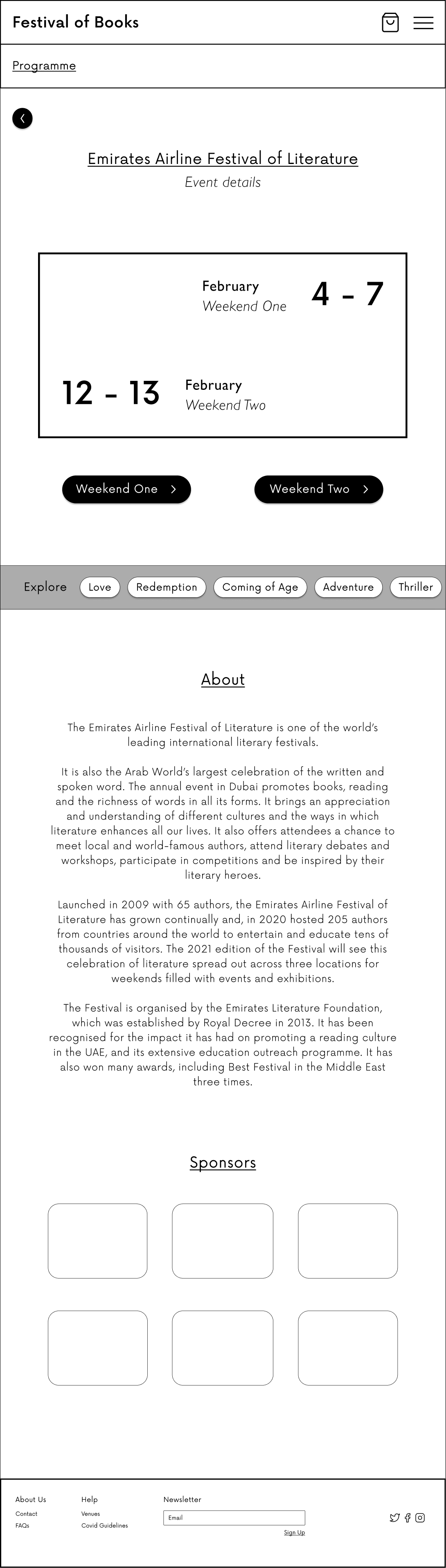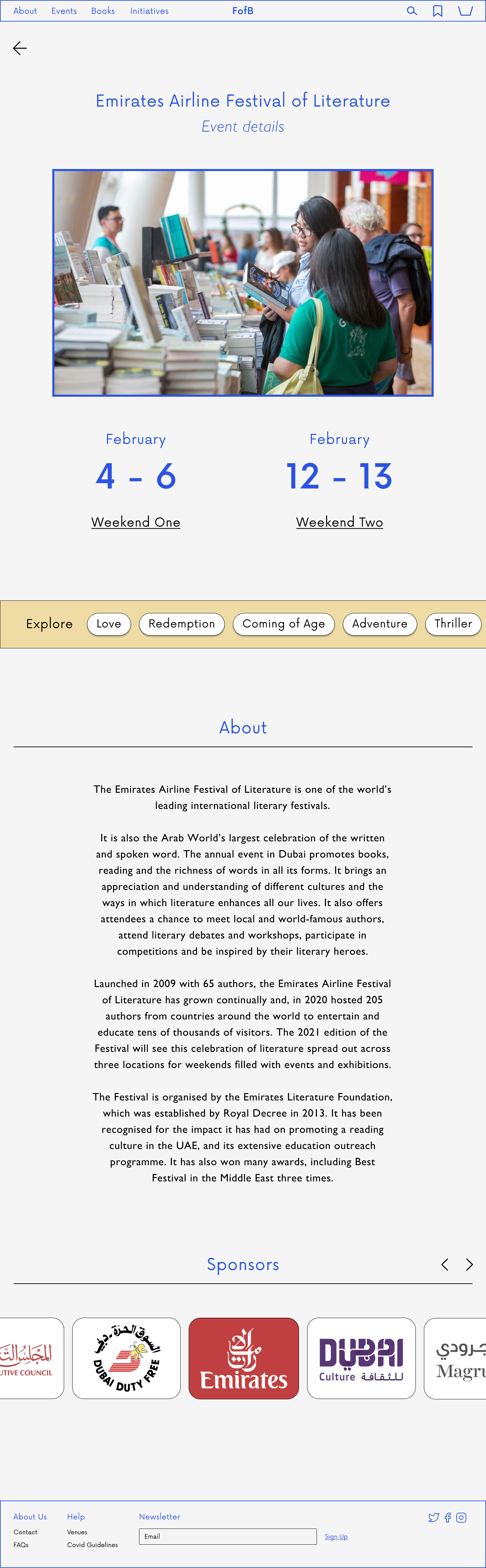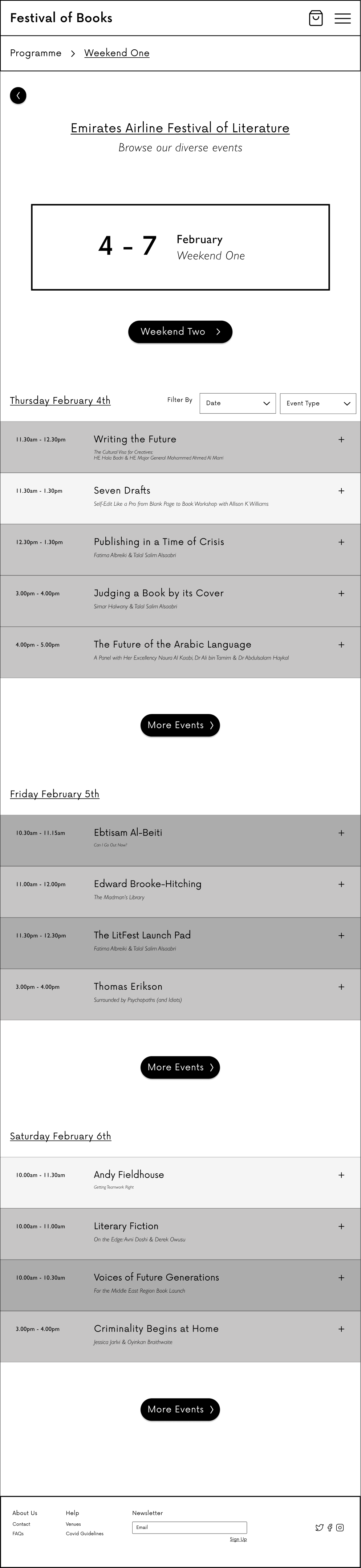 This stage came with a lot of iterations. It was important from a user perspective that the navigation was seamless, the information digestible and the visual design in harmony. Like the initial user interviews it was important to test this initial design on event goers and book lovers to get a real sense of the successes and frustrations.