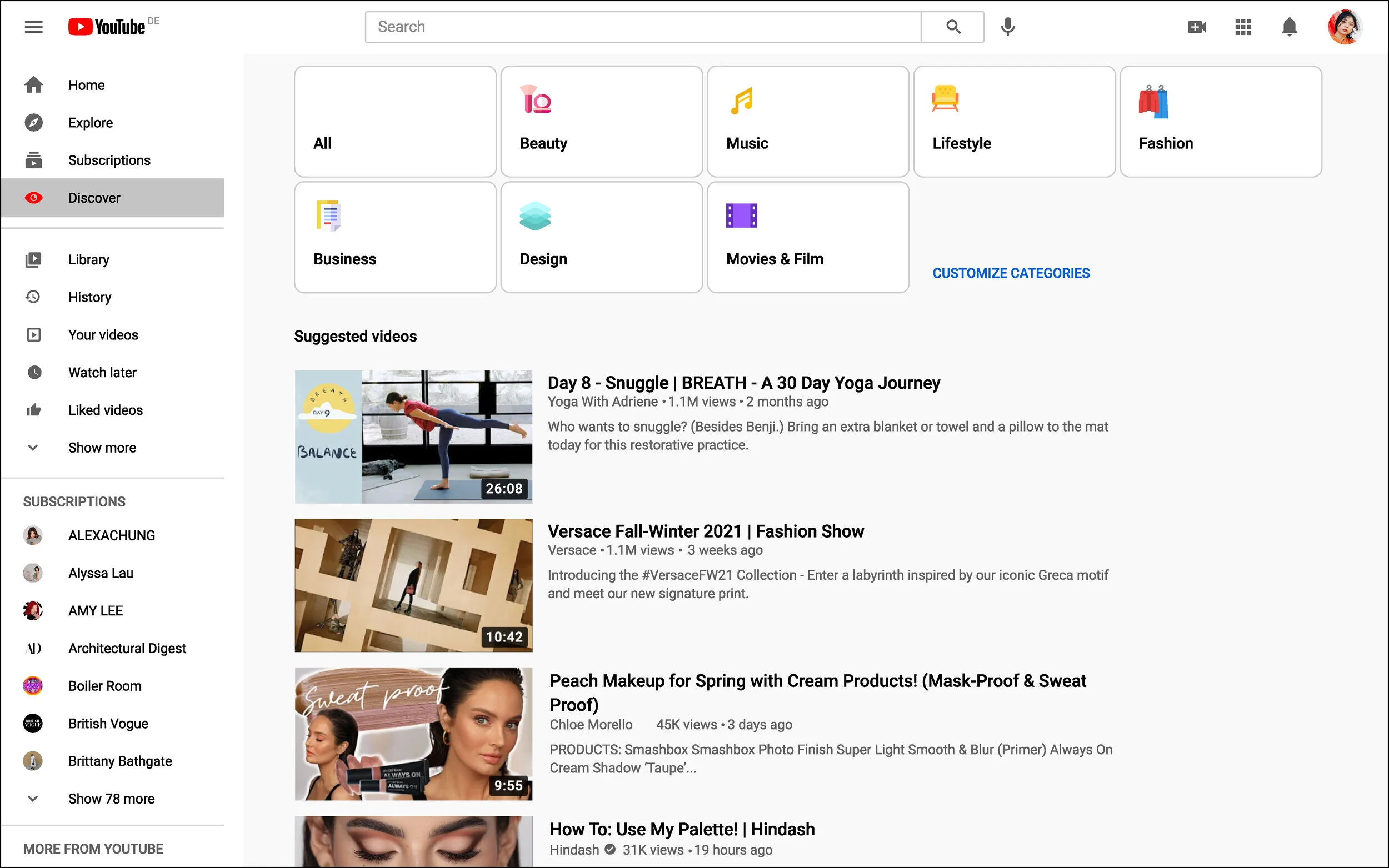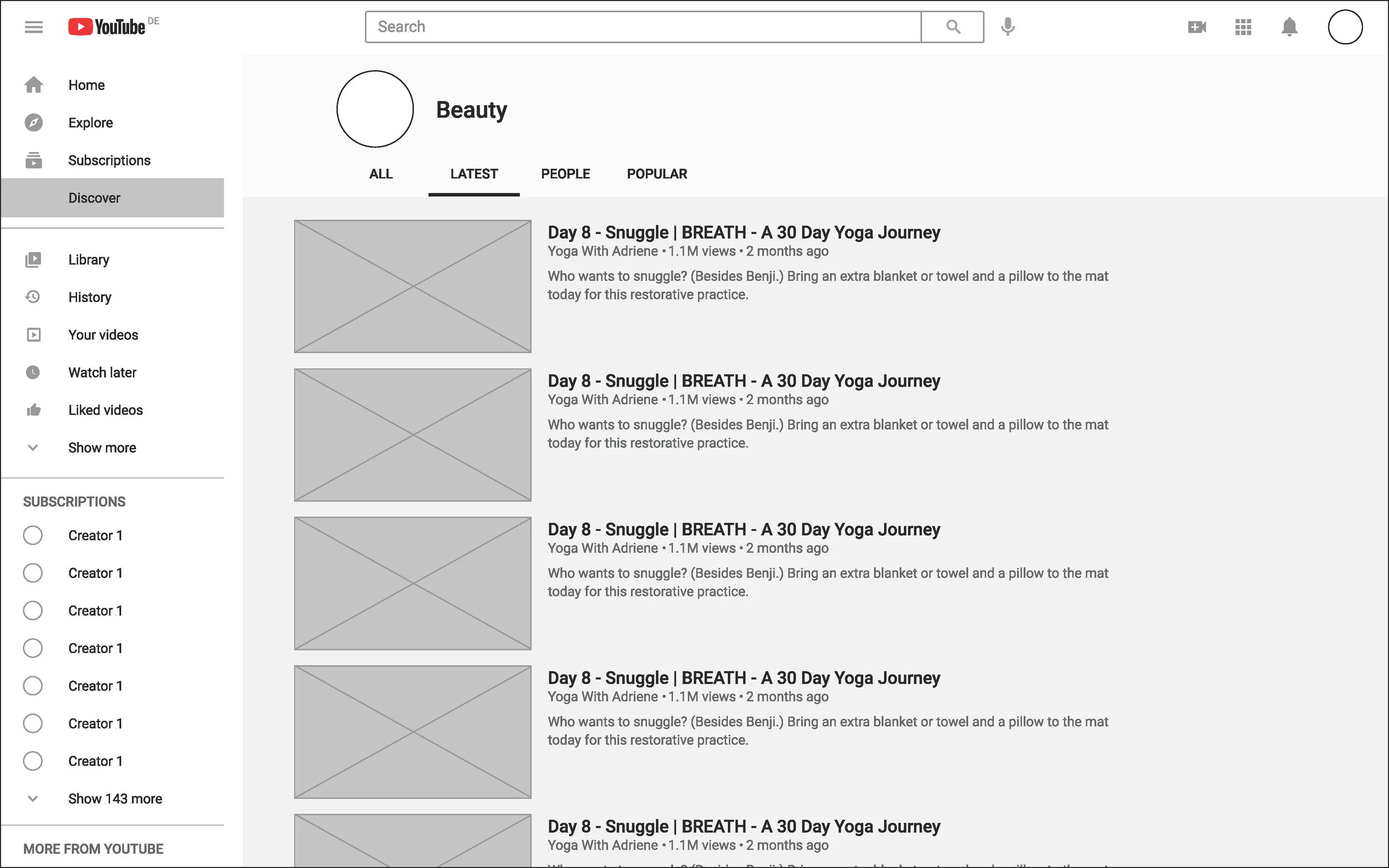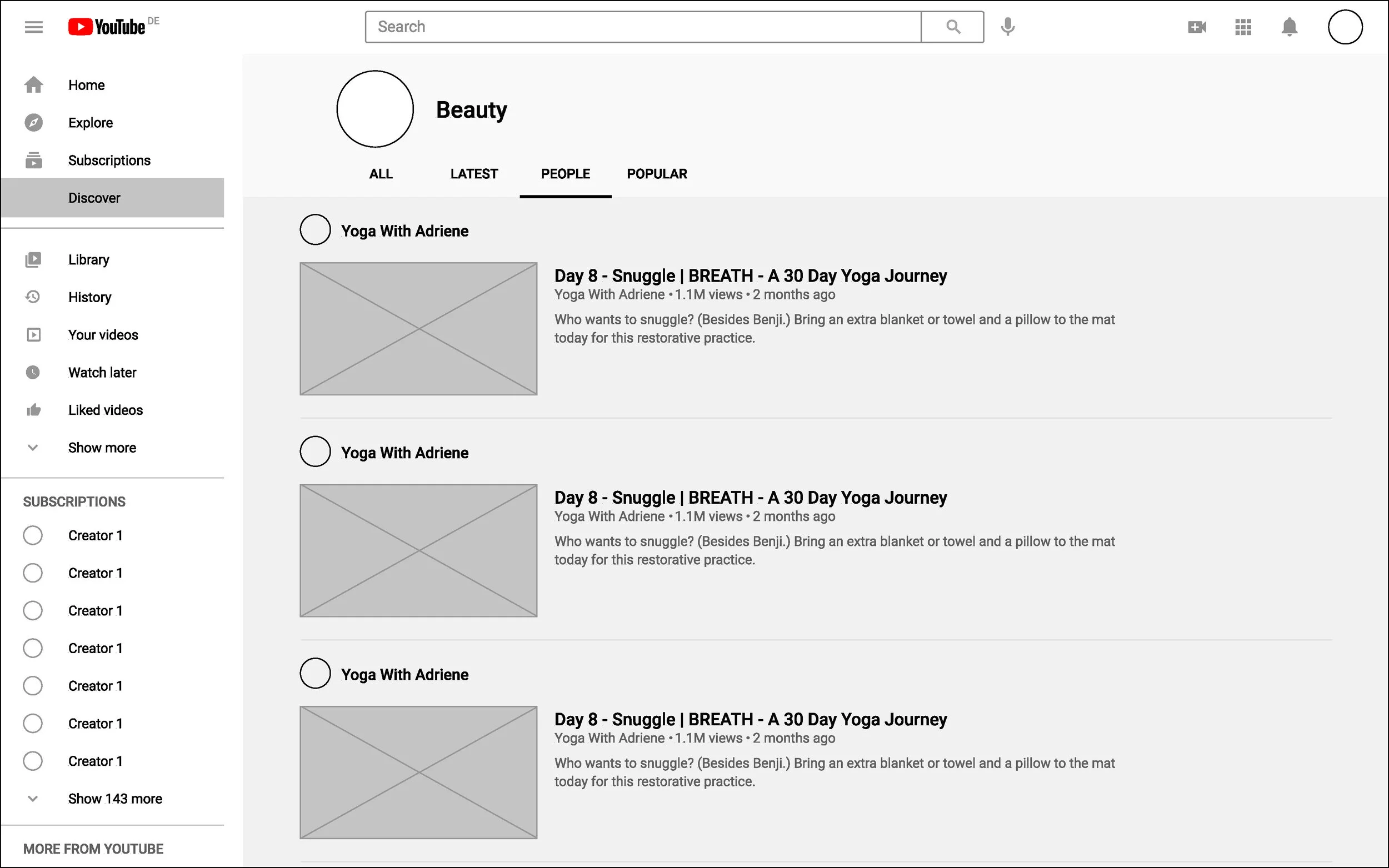 The main challenge I faced creating this additional feature, was to better define the new feature so that new and existing users would have little trouble understanding it. Through usability testing, it was clear that the name ‘Discover’ didn’t create enough of a separation for the existing ‘Explore’ category. It was important that the name of the feature immediately gave users an understanding of its use, through an additional survey the name evolved to ‘Your Categories’ which spoke directly to the feature I had created, a place where users were able to customize categories based on their viewing needs. Ultimately, I feel that I was able to create a feature that would improve the users browsing experience, and also complement YouTube’s existing product.